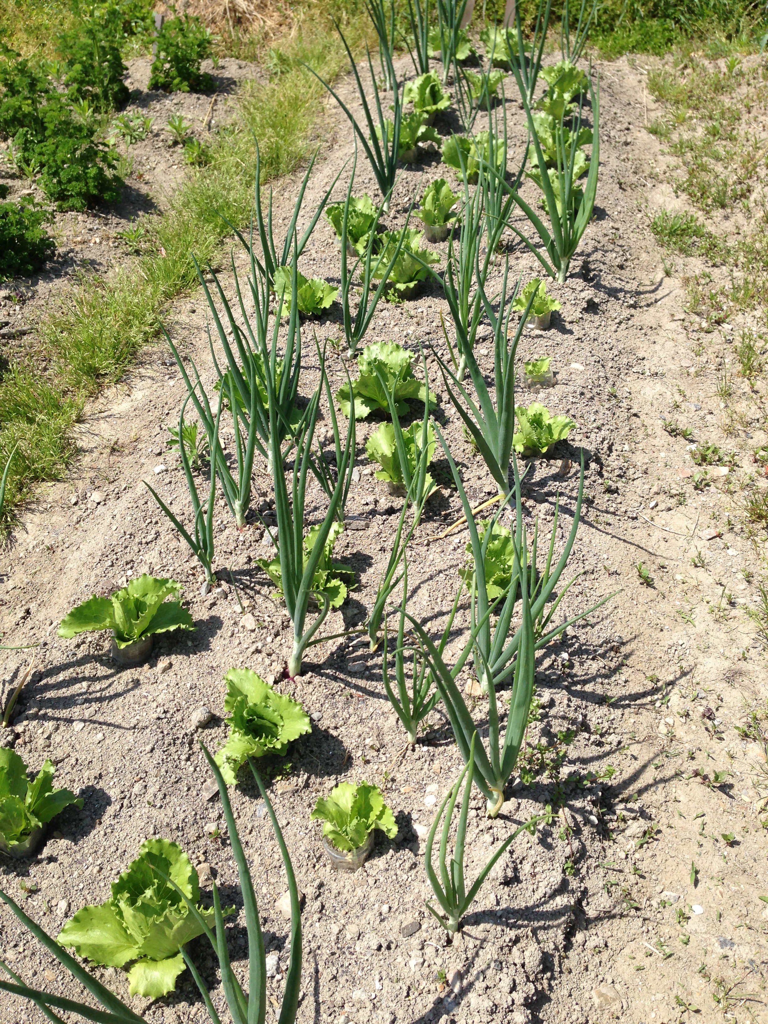 We have also been exploring the practice of companion planting this spring. With reference to the book, Carrots Love Tomatoes by Louise Riotte, we have been trying to both improve our soil fertility as well as maximize on our space. In this picture, we have planted some spring head lettuce among our overwintered bulb onions. We had quite a bit of winter damage to our onion patch, so we inter-planted with lettuce. The main concept here is that companion plants offer a mutually beneficial relationship both above and sub-soil. Some companions deter pests, others form symbiotic nutritional relationships, while others promote healthy growth by providing a bit of shade or keeping moisture in the soil. Its all quite amazing!