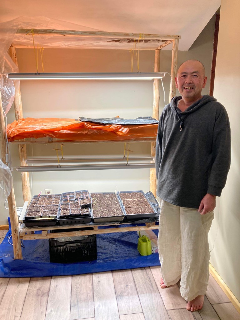 Luckily, we found some wonderful landlords who have been looking for land stewards and farmers for quite some time. So, they have been very helpful with building infrastructure like heavy duty deer fencing, and soon, some greenhouses, a farm-gate sales shed, and a harvest/ storage building as well. The forest provides all the wood we need for these structures and Zenryu is particularly loving all the access to beautiful timber for his building projects. In fact, he built our grow light stand for early seedlings as well as hooks and useful features around the house.